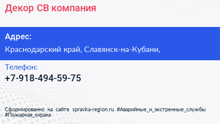 Декор-СВ, компания по адресу Краснодарский край, Славянск-на-Кубани, в дальнейшем Организация, размещена в следующих категориях: