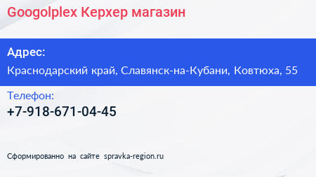 Googolplex Керхер, магазин по адресу Краснодарский край, Славянск-на-Кубани, Ковтюха, 55 в дальнейшем Организация, размещена в следующих категориях: