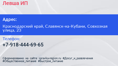 Левша, ИП по адресу Краснодарский край, Славянск-на-Кубани, Совхозная улица, 23 в дальнейшем Организация, размещена в следующих категориях: