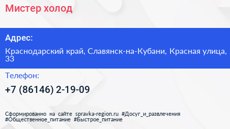 Мистер холод по адресу Краснодарский край, Славянск-на-Кубани, Красная улица, 33 в дальнейшем Организация, размещена в следующих категориях: