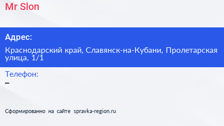 Mr. Slon по адресу Краснодарский край, Славянск-на-Кубани, Пролетарская улица, 1/1 в дальнейшем Организация, размещена в следующих категориях: