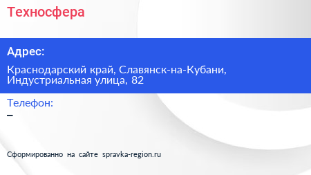 Техносфера по адресу Краснодарский край, Славянск-на-Кубани, Индустриальная улица, 82 в дальнейшем Организация, размещена в следующих категориях: