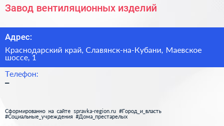 Завод вентиляционных изделий по адресу Краснодарский край, Славянск-на-Кубани, Маевское шоссе, 1 в дальнейшем Организация, размещена в следующих категориях: