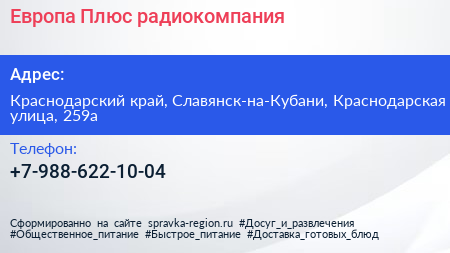Европа Плюс, радиокомпания по адресу Краснодарский край, Славянск-на-Кубани, Краснодарская улица, 259а в дальнейшем Организация, размещена в следующих категориях: