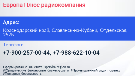 Европа Плюс, радиокомпания по адресу Краснодарский край, Славянск-на-Кубани, Отдельская, 257Б в дальнейшем Организация, размещена в следующих категориях: