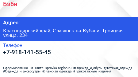 Бэби + по адресу Краснодарский край, Славянск-на-Кубани, Троицкая улица, 234 в дальнейшем Организация, размещена в следующих категориях: