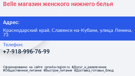 Belle, магазин женского нижнего белья по адресу Краснодарский край, Славянск-на-Кубани, улица Ленина, 73 в дальнейшем Организация, размещена в следующих категориях: