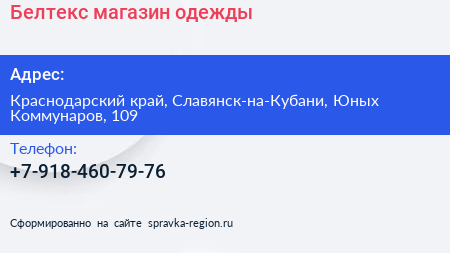Белтекс, магазин одежды по адресу Краснодарский край, Славянск-на-Кубани, Юных Коммунаров, 109 в дальнейшем Организация, размещена в следующих категориях: