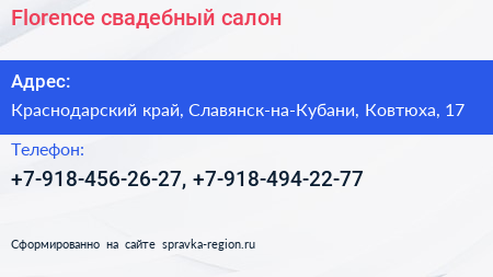 Florence, свадебный салон по адресу Краснодарский край, Славянск-на-Кубани, Ковтюха, 17 в дальнейшем Организация, размещена в следующих категориях: