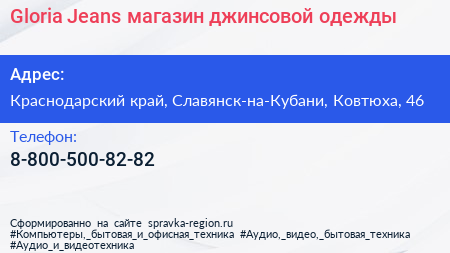 Gloria Jeans, магазин джинсовой одежды по адресу Краснодарский край, Славянск-на-Кубани, Ковтюха, 46 в дальнейшем Организация, размещена в следующих категориях: