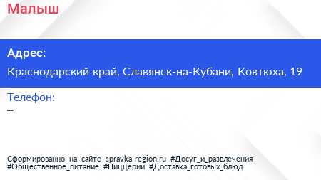 Малыш по адресу Краснодарский край, Славянск-на-Кубани, Ковтюха, 19 в дальнейшем Организация, размещена в следующих категориях:
