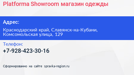 Platforma Showroom, магазин одежды по адресу Краснодарский край, Славянск-на-Кубани, Комсомольская улица, 129 в дальнейшем Организация, размещена в следующих категориях: