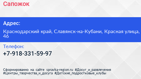 Сапожок по адресу Краснодарский край, Славянск-на-Кубани, Красная улица, 46 в дальнейшем Организация, размещена в следующих категориях: