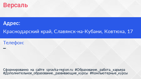 Версаль по адресу Краснодарский край, Славянск-на-Кубани, Ковтюха, 17 в дальнейшем Организация, размещена в следующих категориях: