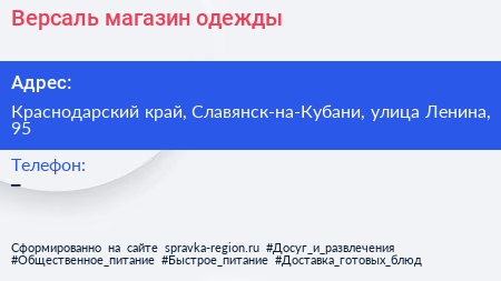 Версаль, магазин одежды по адресу Краснодарский край, Славянск-на-Кубани, улица Ленина, 95 в дальнейшем Организация, размещена в следующих категориях: