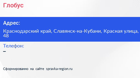 Глобус по адресу Краснодарский край, Славянск-на-Кубани, Красная улица, 48 в дальнейшем Организация, размещена в следующих категориях: