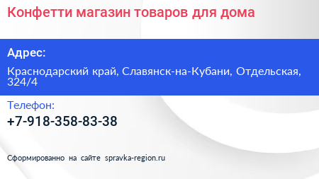 Конфетти, магазин товаров для дома по адресу Краснодарский край, Славянск-на-Кубани, Отдельская, 324/4 в дальнейшем Организация, размещена в следующих категориях: