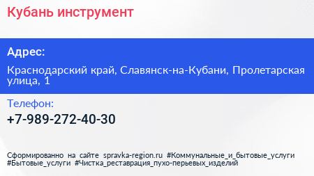 Кубань инструмент по адресу Краснодарский край, Славянск-на-Кубани, Пролетарская улица, 1 в дальнейшем Организация, размещена в следующих категориях: