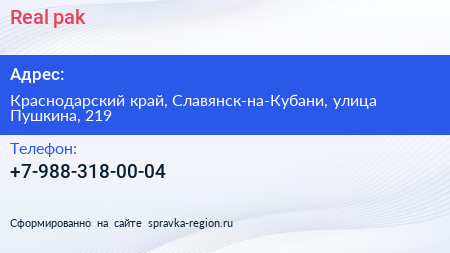 Real-pak по адресу Краснодарский край, Славянск-на-Кубани, улица Пушкина, 219 в дальнейшем Организация, размещена в следующих категориях: