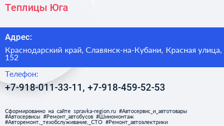 Теплицы-Юга по адресу Краснодарский край, Славянск-на-Кубани, Красная улица, 152 в дальнейшем Организация, размещена в следующих категориях: