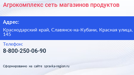 Агрокомплекс, сеть магазинов продуктов по адресу Краснодарский край, Славянск-на-Кубани, Красная улица, 145 в дальнейшем Организация, размещена в следующих категориях: