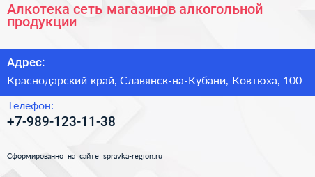 Алкотека, сеть магазинов алкогольной продукции по адресу Краснодарский край, Славянск-на-Кубани, Ковтюха, 100 в дальнейшем Организация, размещена в следующих категориях: