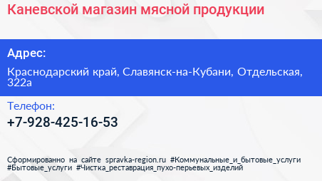 Каневской, магазин мясной продукции по адресу Краснодарский край, Славянск-на-Кубани, Отдельская, 322а в дальнейшем Организация, размещена в следующих категориях: