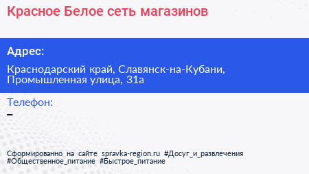 Красное & Белое, сеть магазинов по адресу Краснодарский край, Славянск-на-Кубани, Промышленная улица, 31а в дальнейшем Организация, размещена в следующих категориях: