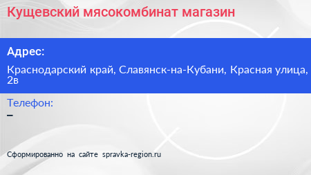 Кущевский мясокомбинат, магазин по адресу Краснодарский край, Славянск-на-Кубани, Красная улица, 2в в дальнейшем Организация, размещена в следующих категориях: