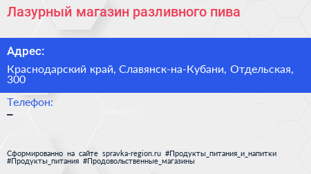Лазурный, магазин разливного пива по адресу Краснодарский край, Славянск-на-Кубани, Отдельская, 300 в дальнейшем Организация, размещена в следующих категориях: