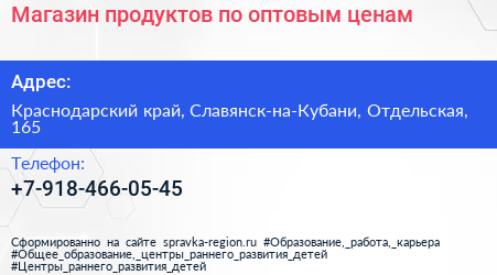 Магазин продуктов по оптовым ценам по адресу Краснодарский край, Славянск-на-Кубани, Отдельская, 165 в дальнейшем Организация, размещена в следующих категориях: