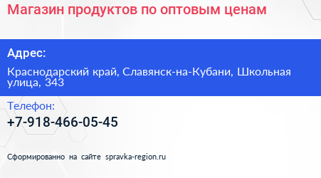 Магазин продуктов по оптовым ценам по адресу Краснодарский край, Славянск-на-Кубани, Школьная улица, 343 в дальнейшем Организация, размещена в следующих категориях: