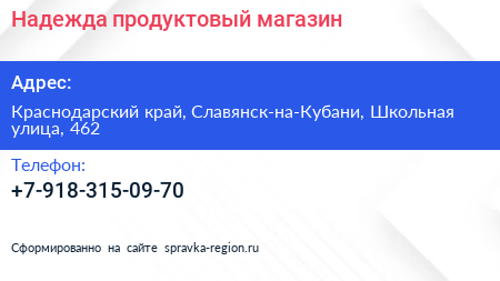 Надежда, продуктовый магазин по адресу Краснодарский край, Славянск-на-Кубани, Школьная улица, 462 в дальнейшем Организация, размещена в следующих категориях: