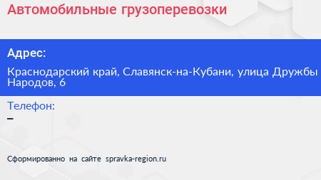 Автомобильные грузоперевозки по адресу Краснодарский край, Славянск-на-Кубани, улица Дружбы Народов, 6 в дальнейшем Организация, размещена в следующих категориях: