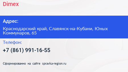 Dimex по адресу Краснодарский край, Славянск-на-Кубани, Юных Коммунаров, 65 в дальнейшем Организация, размещена в следующих категориях: