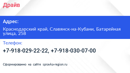 Драйв по адресу Краснодарский край, Славянск-на-Кубани, Батарейная улица, 258 в дальнейшем Организация, размещена в следующих категориях: