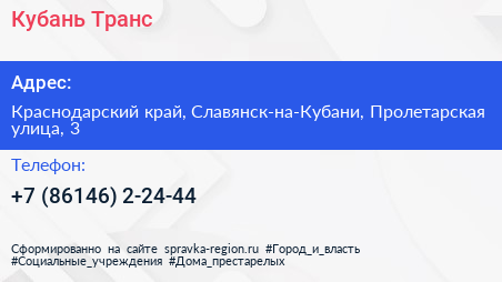 Кубань-Транс по адресу Краснодарский край, Славянск-на-Кубани, Пролетарская улица, 3 в дальнейшем Организация, размещена в следующих категориях: