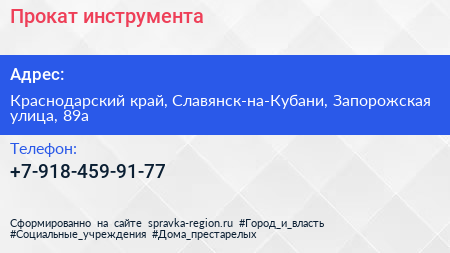 Прокат инструмента по адресу Краснодарский край, Славянск-на-Кубани, Запорожская улица, 89а в дальнейшем Организация, размещена в следующих категориях: