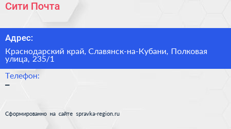 Сити Почта по адресу Краснодарский край, Славянск-на-Кубани, Полковая улица, 235/1 в дальнейшем Организация, размещена в следующих категориях: