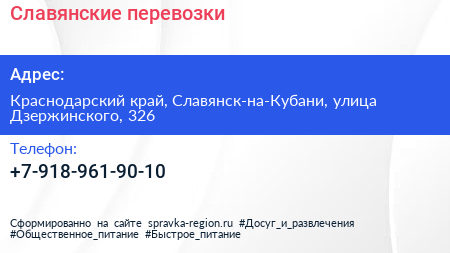 Славянские-перевозки по адресу Краснодарский край, Славянск-на-Кубани, улица Дзержинского, 326 в дальнейшем Организация, размещена в следующих категориях: