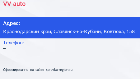VV auto по адресу Краснодарский край, Славянск-на-Кубани, Ковтюха, 158 в дальнейшем Организация, размещена в следующих категориях: