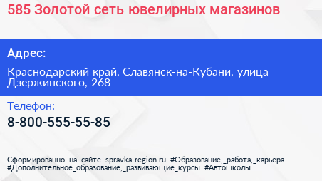 585*Золотой, сеть ювелирных магазинов по адресу Краснодарский край, Славянск-на-Кубани, улица Дзержинского, 268 в дальнейшем Организация, размещена в следующих категориях: