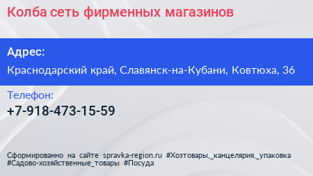 Колба, сеть фирменных магазинов по адресу Краснодарский край, Славянск-на-Кубани, Ковтюха, 36 в дальнейшем Организация, размещена в следующих категориях: