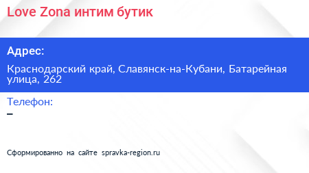 Love Zona, интим-бутик по адресу Краснодарский край, Славянск-на-Кубани, Батарейная улица, 262 в дальнейшем Организация, размещена в следующих категориях:
