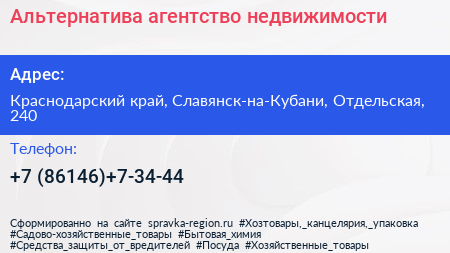 Альтернатива, агентство недвижимости по адресу Краснодарский край, Славянск-на-Кубани, Отдельская, 240 в дальнейшем Организация, размещена в следующих категориях: