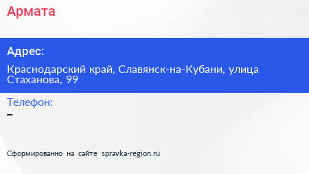 Армата по адресу Краснодарский край, Славянск-на-Кубани, улица Стаханова, 99 в дальнейшем Организация, размещена в следующих категориях: