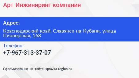 Арт Инжиниринг, компания по адресу Краснодарский край, Славянск-на-Кубани, улица Пионерская, 168 в дальнейшем Организация, размещена в следующих категориях: