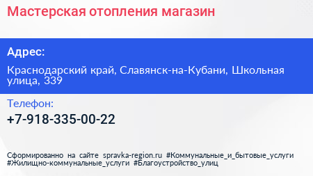 Мастерская отопления, магазин по адресу Краснодарский край, Славянск-на-Кубани, Школьная улица, 339 в дальнейшем Организация, размещена в следующих категориях: