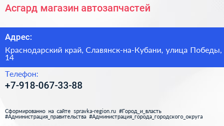 Асгард, магазин автозапчастей по адресу Краснодарский край, Славянск-на-Кубани, улица Победы, 14 в дальнейшем Организация, размещена в следующих категориях: