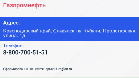 Газпромнефть по адресу Краснодарский край, Славянск-на-Кубани, Пролетарская улица, 1д в дальнейшем Организация, размещена в следующих категориях:
